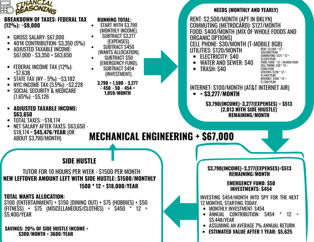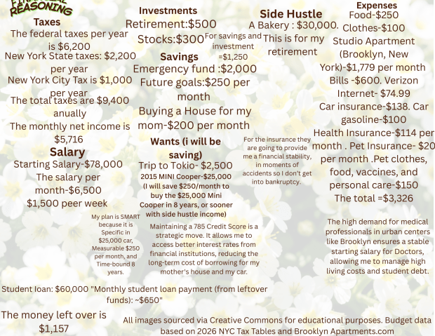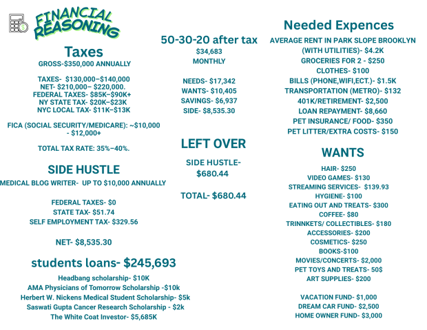Students apply financial literacy concepts (budgeting, credit, taxes, savings, investing) to realistic personal scenarios. Accurately calculate net pay, monthly expenses, and long-term costs associated with career and college choices. Then they analyze how career decisions impact income, lifestyle, and financial stability.